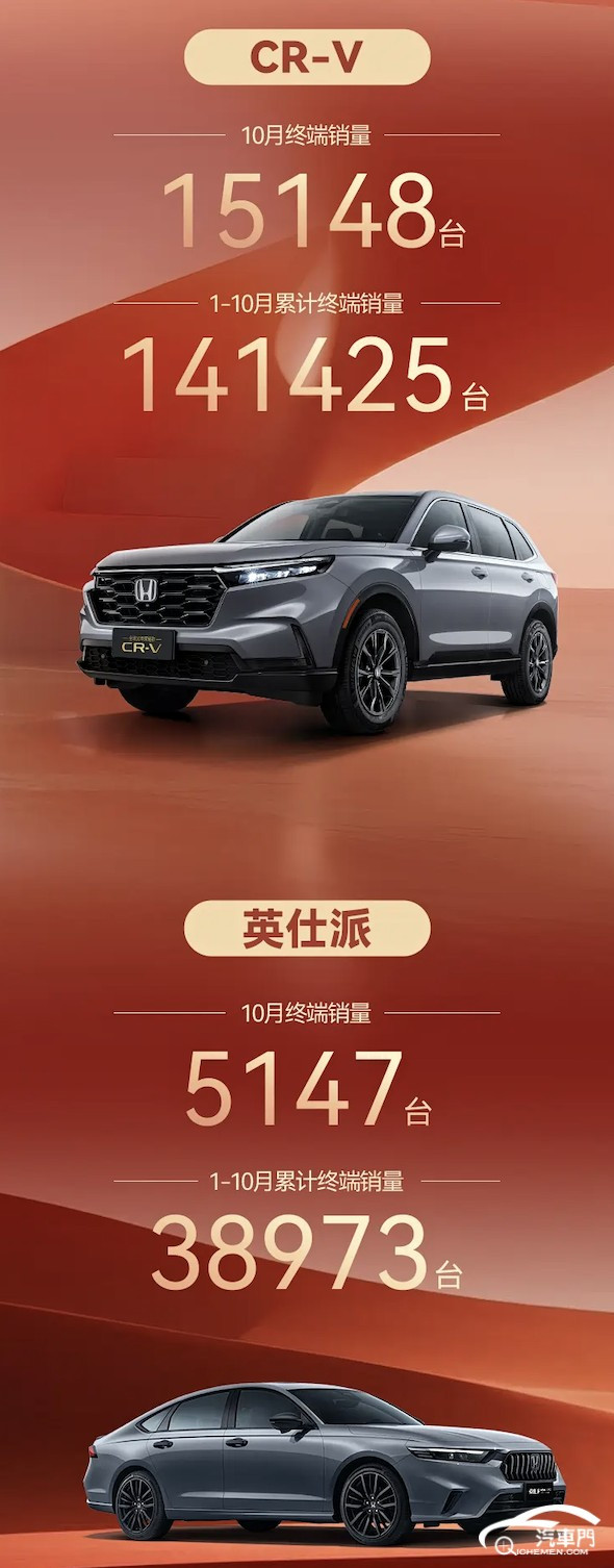 其中,本田CR-V今年10月销量为15148台,英仕派今年10月的销量为5147台。两款车贡献了今年10月东风本田七成以上销量。